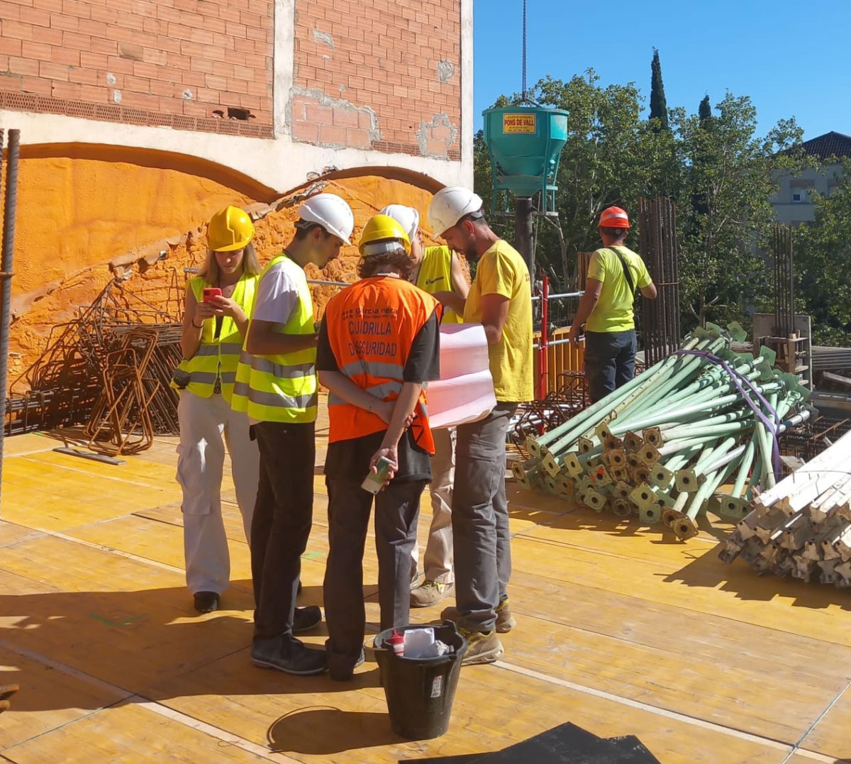 El equipo de la obra de CULMIA Urban Monestir Sant Cugat, que está llevando a cabo GARCIA RIERA, hemos podido colaborar con cuatro estudiantes de la Escuela Técnica Superior de Arquitectura del Vallès, ETSAV –de la Universitat Politècnica de Catalunya, UPC BarcelonaTech– de la asignatura de TECNOLOGÍA-2, con el fin de que puedan hacer un trabajo informativo sobre la puesta en obra de hormigón. La visita se ha efectuado con el visto bueno de los facultativos que tenemos a esta obra: Anabel Busco Bayón, Gerente de Promociones de CULMIA; Jaume Fitó Poch, Arquitecto Director de Obra de FITARQ; Francesc Belart y Calvet, Arquitecto Técnico Director de Ejecución de obra; y Nestor Gutiérrez López, coordinador de seguridad y salud.
